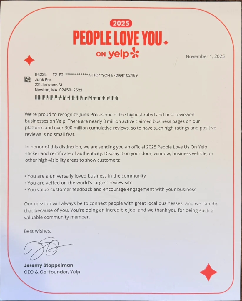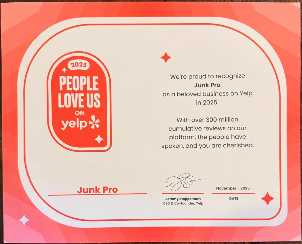 EXCELLENT Based on 33 reviews Posted on Glenn BeckerTrustindex verifies that the original source of the review is Google. I've called on Matt and his crew twice to help remove stuff from my 3rd floor apt, and they are fast, careful and clean to boot (they sawed the legs off a loveseat before taking it down, and carefully swept up after)! These are the guys you want.Posted on Rich PalmerTrustindex verifies that the original source of the review is Google. Matt and his crew were fantastic. We were particularly impressed with the easy and patient scheduling, arriving on time, and being efficient (yet thoughtful) with what we were asking them to take away. Would absolutely use them again and recommend them anyone in the area!Posted on Timothy SutherlandTrustindex verifies that the original source of the review is Google. Great communication and response time, very courteous and a real pleasure to do business with. I used them to haul away scrap materials from a bathroom renovation. Would highly recommend to others!Posted on Deborah KTrustindex verifies that the original source of the review is Google. Excellent and prompt service. Highly recommend for a stress free and easy removal of things from your home which charities don’t want.Posted on Özlem H. KaracaTrustindex verifies that the original source of the review is Google. Junk Pro helped us clean our garage. Wonderful experience - exactly as promised - they were on time, loaded up a ton of junk, swept up and were gone in less than 30 minutes. Matt and his son were very friendly and professional from start to finish! An example of what a service firm should be!Posted on Robert “Bob” CTrustindex verifies that the original source of the review is Google. When I needed to empty my home before moving out, I didn't know what to do. After reading favorable reviews online, I contacted Junk Pro and am glad I did. The process was painless, professional, courteous, and efficient. I highly recommend them.Posted on Christine WhiteTrustindex verifies that the original source of the review is Google. Quick, efficient, friendly!Posted on Chris YeeTrustindex verifies that the original source of the review is Google. I can't even stress how good these guys are. Needed an old couch taken away and the price they quoted me was $100 LESS than their competitors. I may have caught them at a good time, but they were able to come by and pick it up in just 30 minutes from the initial phone call. They were friendly, professional, and masked up.Posted on brian littlefieldTrustindex verifies that the original source of the review is Google. Matt and his guys were great! Excellent communication and very fast. They arrived as scheduled and were very fair with the estimate. Would definitely hire again.